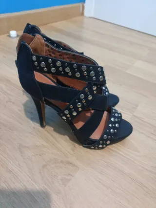 Sandalias de tacón alto de la marca Claudia. Son de color negro y tienen detalles de tachuelas plateadas. - Diseño de tiras con cierre de cremallera. - Tacón fino. - En buen estado, con ligeras señales de uso.