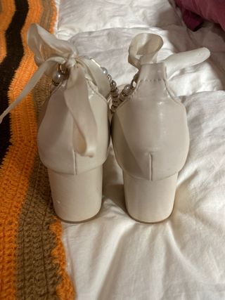 Elegantes tacones con detalles de perlas y lazo. -Talla 38. - Diseño sofisticado. - Tono beige y blanco.