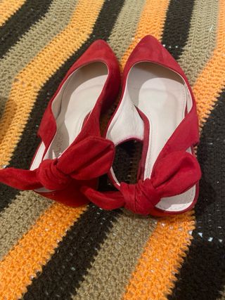 -Lote de tres pares de zapatos. - Dos pares de sandalias esparto en tono beige.Nuevas. - Un par de zapatos de salón rojos con lazo.Puestos 2 veces. - Talla 37.