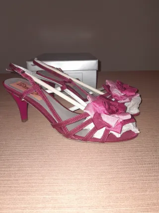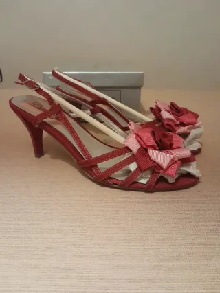 Sandalias de tacón con un diseño de tiras cruzadas y detalle de flor que favorece mucho la punta. Tacón cómodo de 7 cm. Preciosas y en perfectas condiciones, usadas solo una vez.