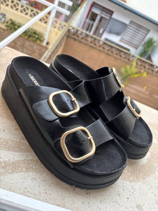 Sandalias de plataforma Bershka, perfectas para el verano. - Diseño con dos tiras frontales. - Hebillas metálicas doradas. - Suela gruesa y cómoda.