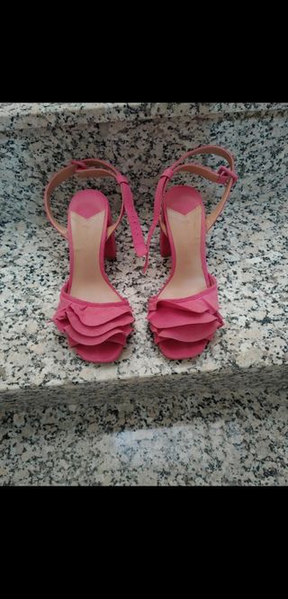 Sandalias rosa fucsia con tacón cuadrado comodísimo. Las tiras de sujeción son dobles, por lo que rodean el tobillo dándole un toque muy elegante. Volantes delanteros muy decorativos y para hacer que el zapato luzca más. No tienen ninguna rotura y estan en muy buen estado pese a su uso