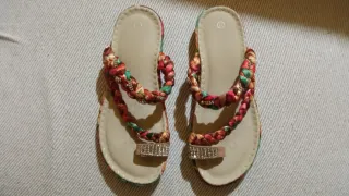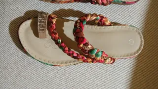 Sandalias de dedo para mujer con un diseño de tejido trenzado y adornos brillantes. Número 37. Muy bonitas. Perfecto estado, poco uso. - Tira de dedo con detalle de pedrería. - Tira superior trenzada con hilos de colores. - Suela cómoda y plana.
