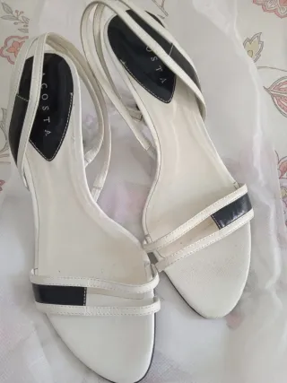 Elegantes sandalias de tacón con tiras. - Diseño bicolor en blanco y negro. - Tacón fino y esbelto 7cm - Tiras finas que cruzan el empeine y tobillo.