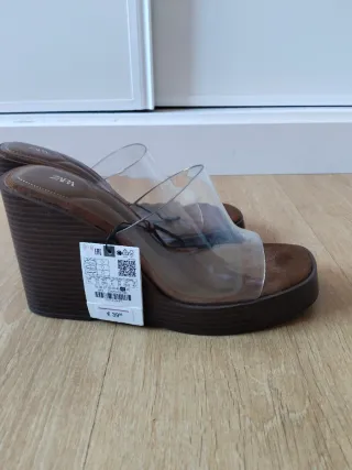 Sandalias de cuña de la marca Zara con tiras transparentes. - Material exterior sintético y suela de goma. - Diseño de cuña alta. - Cierre sin cierres (mules). - Detalle de logo en la plantilla.