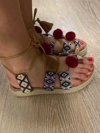 Sandalias de estilo bohemio con adornos coloridos y atadas a la pierna. Son muy cómodas para el día a día. - Adornos de flecos y cuentas. - Cierre con tiras para atar al tobillo. - Diseño étnico y vibrante.