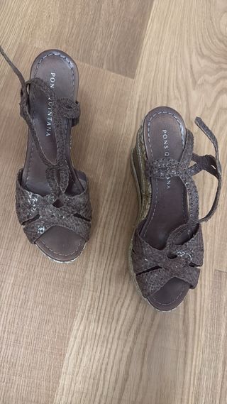 Preciosas sandalias de cuña, ideales para el verano. Como nuevas - Color azul marino y marrón. - Suela de esparto. - Cierre con hebilla.