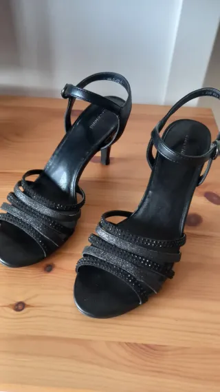 Preciosos zapatos de tacón con tiras adornadas. - Diseño de tiras finas. - Detalle de pedrería y tejido brillante. - Cierre de hebilla en el tobillo. - Los llevé al zapatero para que los reforzara de la planta para que fuesen más cómodos.