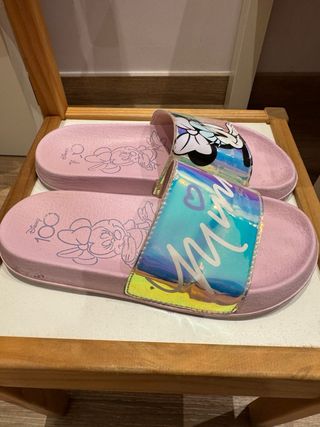 Chancletas de Minnie Mouse con un diseño divertido y colorido. - Banda frontal iridiscente con Minnie Mouse. - Estampado Disney 100 en la plantilla. - Color base rosa.