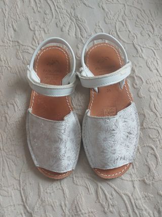 Sandalias de esparto con detalles de encaje. Material exterior de tela. Suela de esparto. Adornos de encaje en los laterales. De niña, blancas y beiges, con lazos para atar de tela se saco y encaje. Talla 34 (no 35). Utilizadas solo una vez en la primera comunión. Precio: 15€
