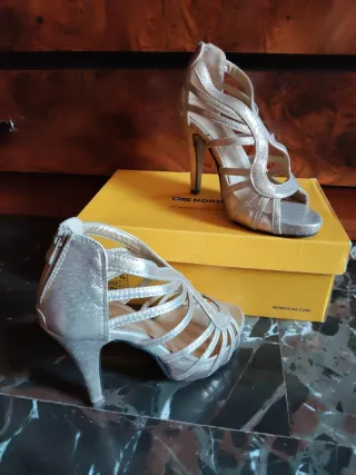 Elegantes sandalias de tacón con un diseño abierto y detalles de tiras. Me las puse solo para mí boda en la playa y han estado guardadas todo el tiempo. Me acabo de dar cuenta que tienen un pequeño defecto, en la sandalia izquierda, si os fijáis tiene un pequeño rozón blanco. Por lo demás están muy bien, las he revisado y tienen esa pequeña tara. Tienen su caja original. Son bastante cómodas las vendo porque me operaron de los pies y no puedo volver a llevar tacones. - Color plateado brillante. - Talla 38. - Marca Membur.