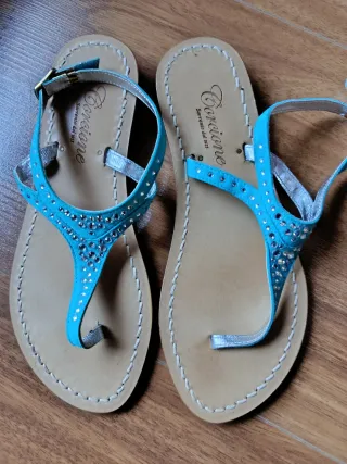 Sandalias planas de la marca Capriccio, hechas en Italia. - Diseño con tiras adornadas con pedrería. - Tira con hebilla ajustable en el tobillo. - Suela cómoda con detalle de costura.