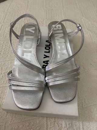 En la foto se ven unas sombras pero están perfectas están sin estrenar esas sombras son efectos de la fotografía. Sandalias de Bimba y Lola con un diseño moderno y elegante. SIN ESTRENAR - Acabado metalizado plateado. - Tiras cruzadas en la parte delantera. - Cierre con hebilla en el tobillo.