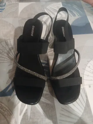 Sandalias elegantes con tiras cruzadas y detalle metálico. - Tira ajustable en el tobillo. - Suela cómoda, sin estrenar, muy cómodas. Tacón mide 5 cm y medio.