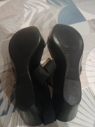 Elegantes sandalias de cuña para mujer. - Color azul marino. - Tira delantera adornada con pedrería plateada. - Cierre de hebilla. - Suela imitación de madera. Las he usado un par de veces. Contactar con Kärol por whatsapp. 675254189. Mira mi perfil hay más cositas!!!