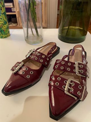 Sandalias de punta con un diseño moderno y detalles metálicos. - Acabado brillante. - Dos correas con ojales y hebillas plateadas. - Diseño slingback.