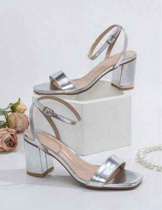 Elegantes tacones plateados con un diseño moderno. - Tacón cuadrado. - Tiras finas cruzadas en la parte delantera. - Cierre de pulsera al tobillo.