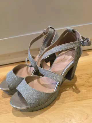 Sandalias de fiesta. Usadas para una única boda. Color plateado. Tacón de unos 10-12cm. Me costaron 40€. - Diseño de tiras. - Cierre de hebilla en el tobillo. - Tacón grueso y cuadrado.