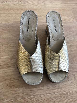 Sandalias de tacón de la marca Pons Quintana. Son de color dorado suave y talla 40. Se encuentran en buen estado. - Diseño de tiras cruzadas. - Tacón de cuña.