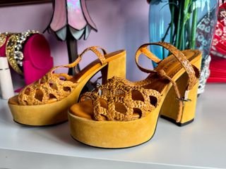Sandalias de piel con un diseño trenzado y plataforma. - Material: Piel - Color: Marrón y amarillo - Talla: 37 - altura tacón 12 cm. plataforma 4 cm