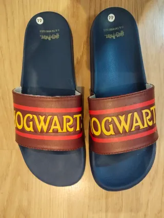 Chanclas azules con diseño de Harry Potter y el lema Hogwarts. - Banda superior en color burdeos con detalles en rojo y letras amarillas. - Logo de Harry Potter y talla 44 en la plantilla. Entrega en mano en Burgos