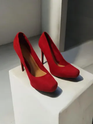 Elegantes tacones rojos de Stradivarius. Un clásico que no puede faltar en tu armario. - Diseño de punta cuadrada. - Tacón de aguja. - Material tipo ante.