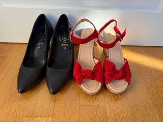 Lote de dos pares de zapatos de mujer de la marca Marypaz. - Un par de zapatos negros de tacón de piel. - Un par de sandalias rojas con lazo de piel