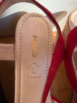 De color rojo, con brillo y hebilla dorada. Poco usadas. Plantillas de corcho. Suela lavada con agua y jabón neutro.