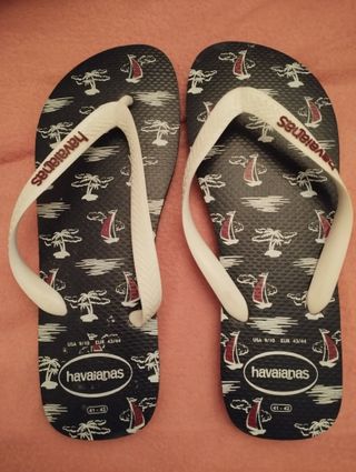 Chanclas numero 43 (28 cm plantilla) Ajustables en anchura (llevan velcro y se pueden hacer más pequeñas o más grandes) *solo quitada etiqueta y probadas *la izquierda tiene como una minimarca dentro, pero venia asi de fabrica (mirar ultima foto) Tira ancha con detalles de rayas rojas, azul marino y blancas. Suela contorneada para mayor confort.