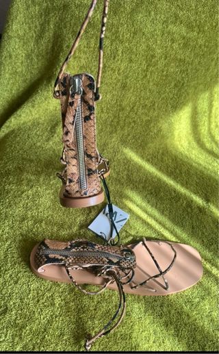 Sandalias planas de estilo romano con estampado de serpiente y detalles en dorado. Son dos sandalias. - Diseño de tiras entrelazadas. - Adornos metálicos redondos. - Cierre en el tobillo.