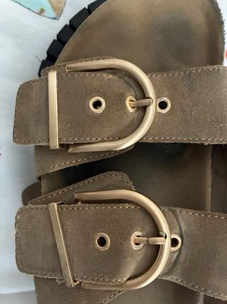 Sandalias de la marca Stradivarius en color beige con detalles dorados. - Diseño con dos tiras frontales. - Hebillas doradas. - Cierre de velcro en la tira trasera.