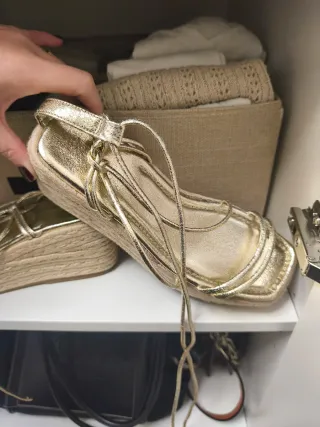 Sandalias doradas con un diseño elegante y moderno. - Material exterior brillante. - Tiras finas para atar al tobillo. - Suela con acabado de esparto. Sin estrenar