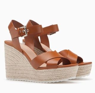 Sandalias de cuña con plataforma de esparto en tonos marrones y beige. - Diseño de tiras cruzadas en la parte delantera. - Correa ajustable al tobillo con hebilla dorada. - Plataforma y cuña forradas de esparto trenzado. No pesan nada.