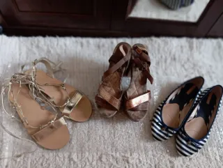 Lote de tres pares de sandalias para mujer. Marcas : Stradivarius, Forever 21 - Sandalias doradas con tiras finas y atadas al tobillo. - Sandalias marrones con cuña y detalle metálico. - Sandalias de estilo bailarina a rayas azules y blancas.