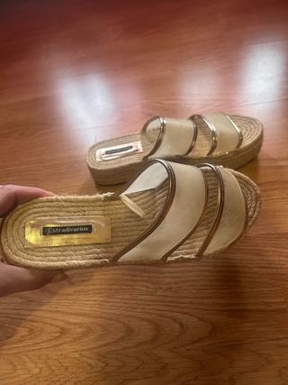 Sandalias planas de esparto con tiras doradas entrelazadas. Son preciosas y elegantes, ideales para verano. - Material: esparto y tiras doradas. - Estilo: atadas al tobillo. - Color: beige y dorado. - Perfecto estado.