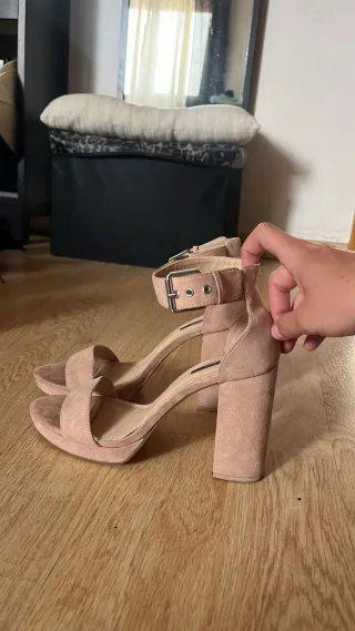 Sandalias de tacón de la marca Stradivarius. Solo una puesta. N-37 - Diseño de plataforma. - Tira en el tobillo con hebilla. - Punta cuadrada.