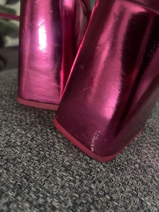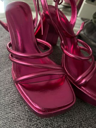 Sandalias de tacón con un llamativo acabado metalizado en color rosa. - Diseño de tiras finas. - Plataforma delantera. - Tacón grueso. Con una raya que se ve en la foto por eso su económico precio