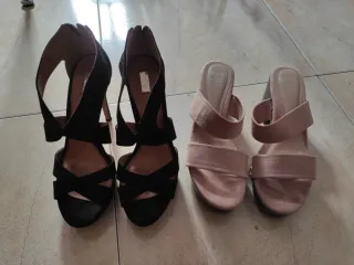 Par de zapatos de tacón y sandalias. - Zapatos de tacón negros con tiras cruzadas. - Sandalias rosas de plataforma con dos tiras.