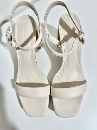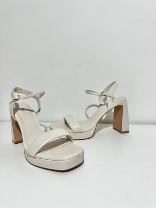 Sandalias de tacón con plataforma de la marca Stradivarius. Color crema. Están nuevos puestos una sola vez Diseño elegante y moderno. - Tira delantera ancha. - Correa ajustable al tobillo con hebilla.