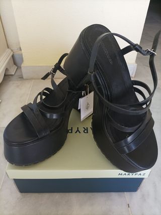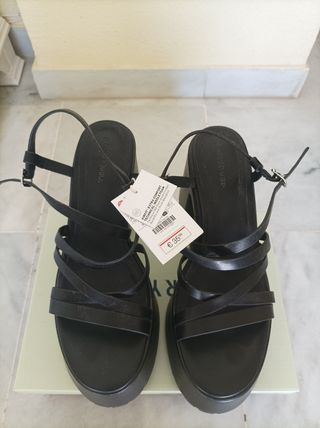 Sandalias de tacón plataforma color negro de la última temporada de Stradivarius. Están nuevos (con etiqueta). Sólo se han usado una vez. Altos, pero muy cómodos debido a su plataforma. Hago envíos