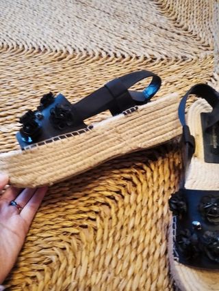 Sandalias de plataformas negras con suela tipo corcho, un poco gastada por la parte delantera pero casi imperceptible