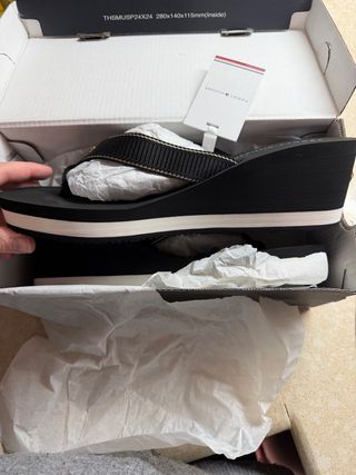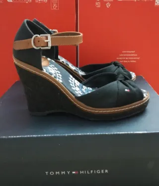 Sandalias originales Tommy Hilfiger talla 36 en perfecto estado. Usadas en dos ocasiones. Cuña trenzada beige y negra, tiras negras con hebilla metálica y plantilla cómoda. Ideales para primavera/verano.