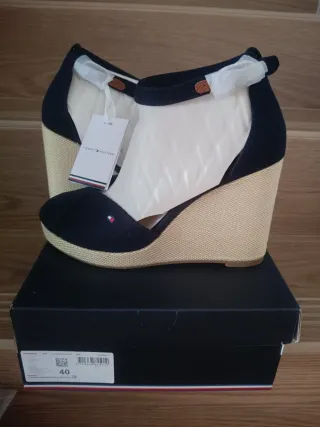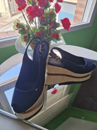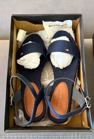 Sandalias originales Tommy Hilfiger en color azul marino. ✔ Talla 37 ✔ Nuevas, sin uso ✔ Con caja original ✔ Ticket de compra disponible ✔ Cuña tipo esparto ✔ Cierre con hebilla ajustable ✔ Logo bordado en la parte frontal Están completamente nuevas, solo guardadas. Modelo muy combinable para verano, perfectas con vestidos, jeans o looks casual chic.