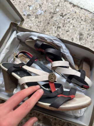 Sandalias de cuña de la marca Tommy Hilfiger en color azul. - Diseño con tiras frontales en blanco, rojo y azul. - Cierre de pulsera al tobillo. - Detalle de logo en la plantilla. Las vendo porque me equivoque de talla y no me dejaban devolverlas sin la caja original. Estan como nuevas, no las he utilizado ni una vez porque me venian algo grandes.