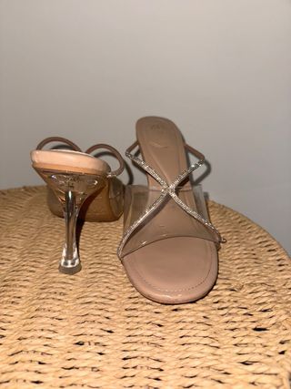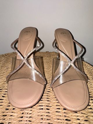 Elegantes sandalias de tacón de Zara con un diseño moderno y detalles brillantes. - Tacón transparente. - Tiras adornadas con pedrería. - Diseño destalonado.
