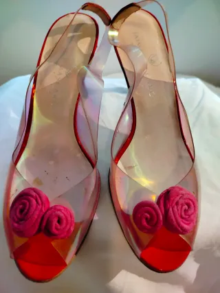 Elegantes sandalias con un diseño moderno y llamativo. - Tacón transparente con detalles en rosa - Tira en el tobillo con hebilla. - Suela bastante estrecha.