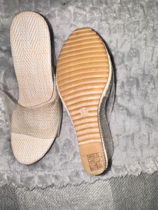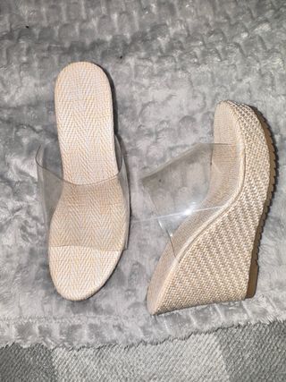 Sandalias de tacón de cuña con tira de vinilo de la marca Stradivarius, NUEVAS, sin estrenar. Talla 41 - Diseño con tira frontal transparente. - Cierre de pulsera al tobillo. - Cuña de altura media. Recogida en Madrid metro de Urgel o en Villaviciosa de Odón.