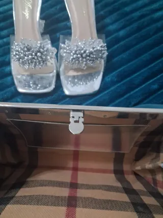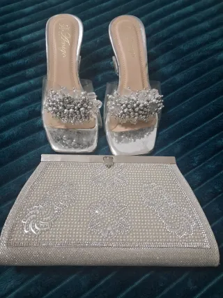 Elegante conjunto de bolso de mano y sandalias. - Bolso de mano plateado con adornos de perlas y pedrería. - Sandalias transparentes con tiras adornadas con pedrería y cuentas plateadas. - Tacón cuadrado y suela plateada en las sandalias.