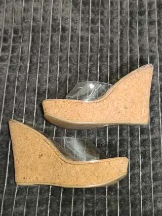 Sandalias de tacon, sin estrenar,transparente, tipo zanco, aunque pone talla 41 equivale a un 40.