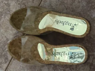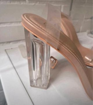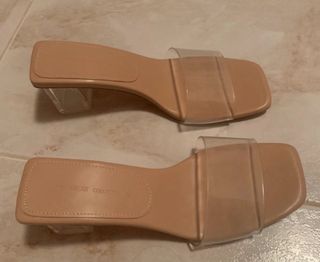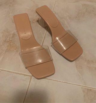 Chanclas de la marca Shein en color beige con tiras transparentes. Tacon de 6 cm. Son muy cómodos y las tiras no hacen daño, no estoy acostumbrada usar tacones y me resulta bastante fácil aguantar y andar con ellos. Como tacon es ancho y las tiras se ajustan muy bien tienes estabilidad y aggare muy bueno. Como se ve no están usadas más que 2-3 veces. - Diseño moderno y cómodo. - Tiras de material transparente. - Suela de color beige.